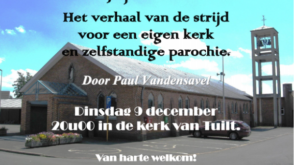 Paul Vandensavel neemt ons mee in de geschiedenis van de strijd van het gehucht Tuilt om hun eigen parochie en eigen kerk te krijgen. Hij laat ons samen terugblikken op de mensen, momenten en mijlpalen die uiteindelijk ertoe hebben geleid dat Tuilt vandaag het 70-jarig bestaan kan vieren van de parochie St. Jozef, als een hechte, warme gemeenschap. Kom luisteren op dinsdag 9 december om 20.00 u in de kerk van Tuilt, en samen genieten van een inspirerende avond vol verbondenheid voor oud en jong! Achteraf kan er verder gepraat worden en herinneringen gedeeld in 't Weekend.